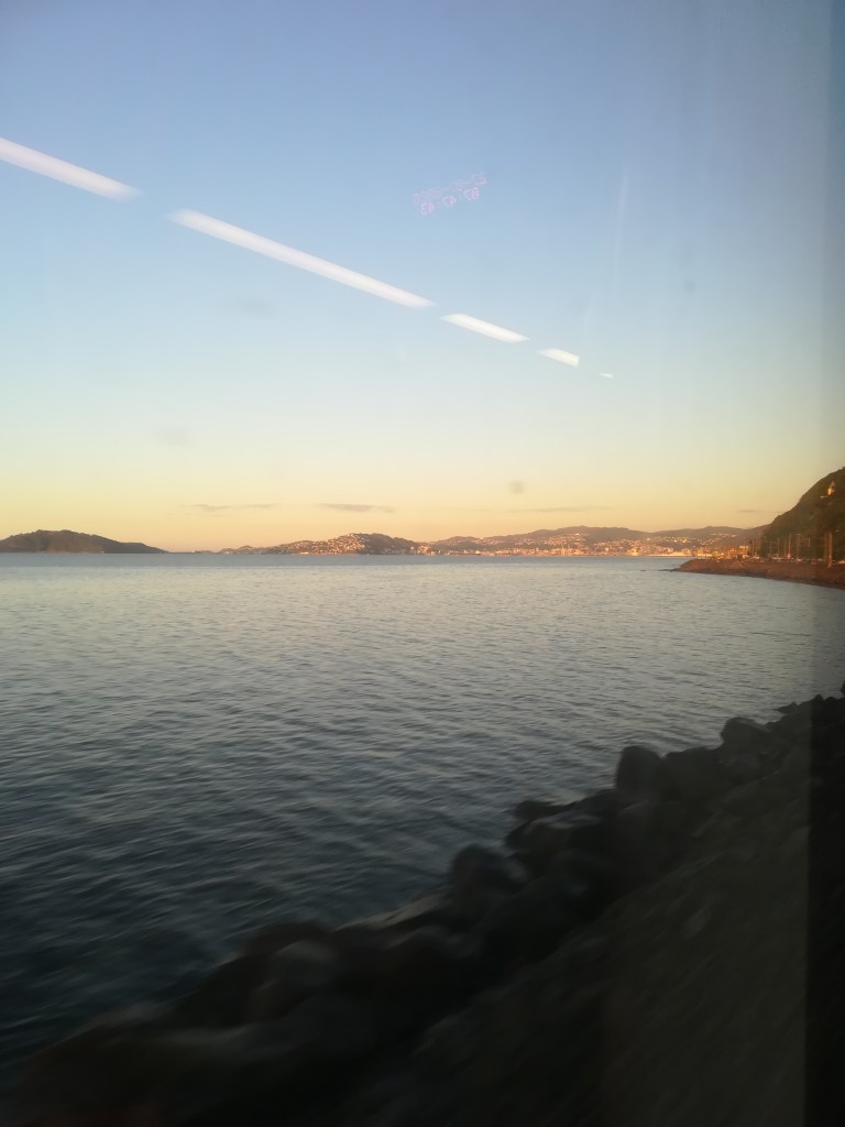 Not too early to start on the cliches. Photo from the train as it travels between the Hutt Valley and Wellington. When the Sun is just coming up and the harbour is calm it is just lovely.