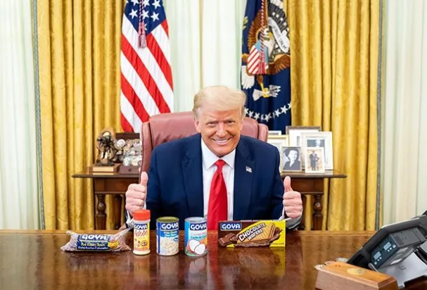 He’s even posted a photo of himself promoting a range of his friend’s – Goya CEO Robert Unanue – products ON THE OVAL OFFICE DESK on his Instragram account. It’s true! I doubt even Saturday Night Live would come up with something so batshit bonkers.