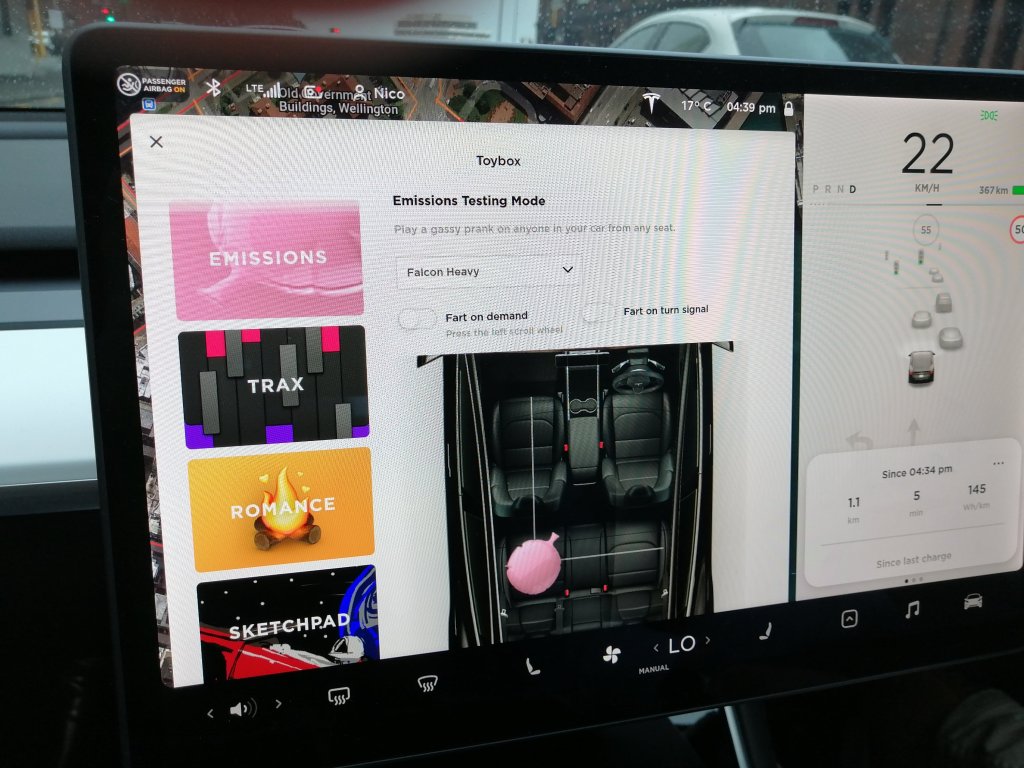 But the coolest thing – which also shows that Elon Musk has a sense of humour – is it has a Fart Mode where you can parp out of the speakers to your childish heart’s delight. I have to do it manually in my sad little Leaf.