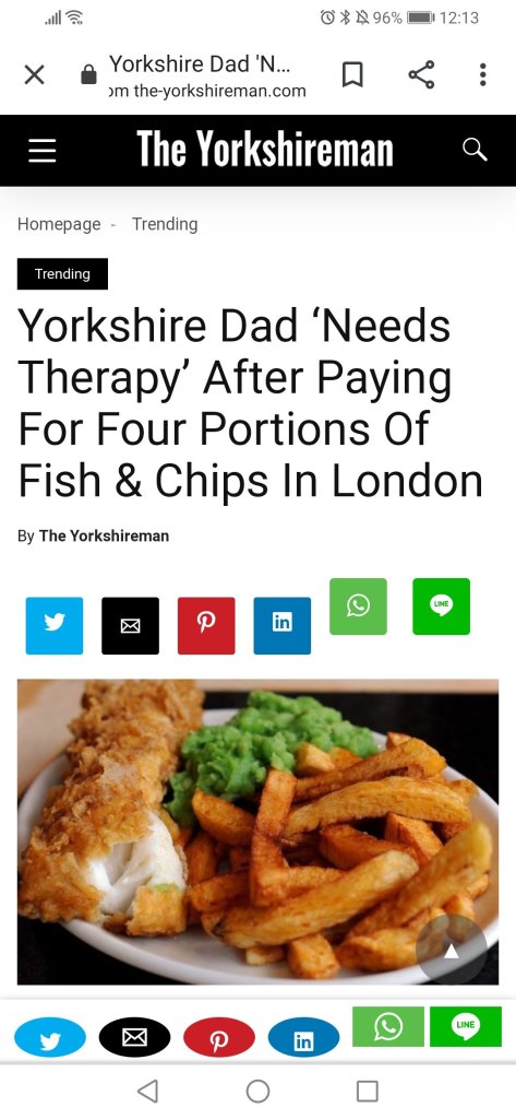 How bloody much?! Thought Dad had been down to That There London when I saw the headline! 54 quid for four fish and chips! Share this: Click to share on X (Opens in new window) X Click to share on Facebook (Opens in new window) Facebook Like Loading... Related Comments are closed.