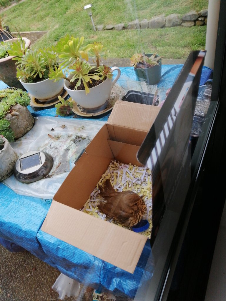 We have a confused little chick stuck on our patio since last night. Put some water and seeds out for it this morning but not showing any signs of recovering as yet so have escalated to making a little safety box nest to get it out of sight of cats (and a certain spaniel) and hope its mother comes to fetch it home.