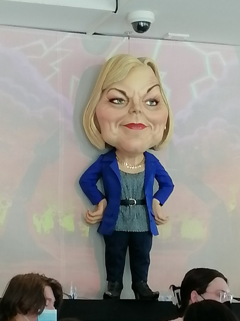 Not two minutes after I took this photo the lady herself walked into the pub, settling at a table 10 feet away from us (and her puppet) with her team.