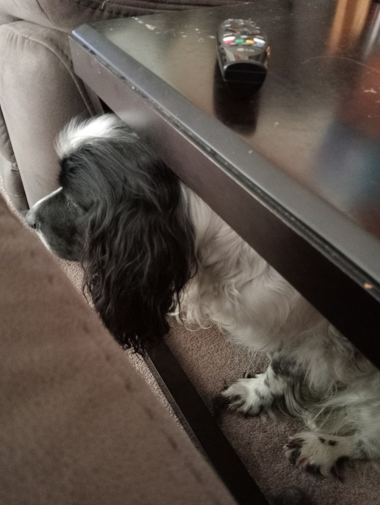 The dog is hiding under the table because she’s scared of a fly. She’ll bark at humans and warn off other dogs twice her size down the park. But if a noisy fly starts dive bombing her she’s off. Can’t blame her, I’m like that with wasps.