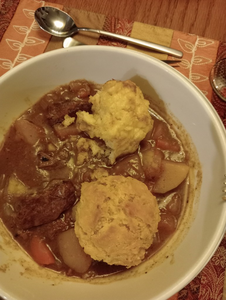 The Duchess has been passing on her repertoire of recipes to ensure that I eat properly once she’s karked it — hopefully not for some time! — with beef stew and dumplings being the latest lesson.