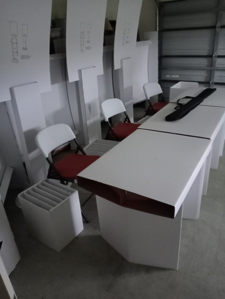 They’ve put up some cardboard walls to (mostly) hide our rubbish, with cardboard desks and voting booths. Thankfully the voting signs are sturdy plastic as it’s blowing a gale and raining sideways today.