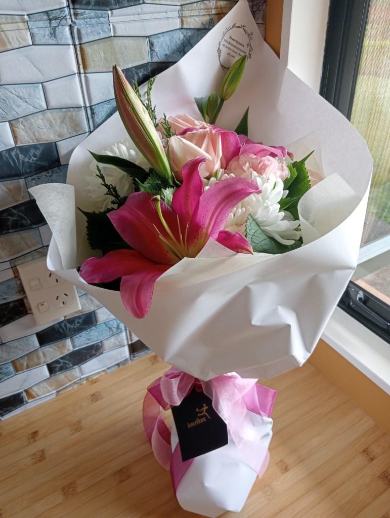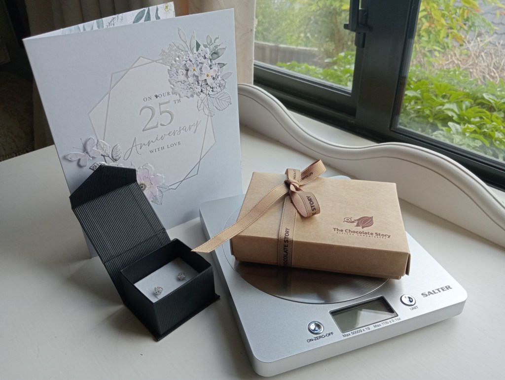 Did the stereotypical presents – flowers (from our friend Rosie’s award-winning florists), some very nice chocs, a bit of silver bling and some slightly less romantic (but still silver) kitchen scales.
