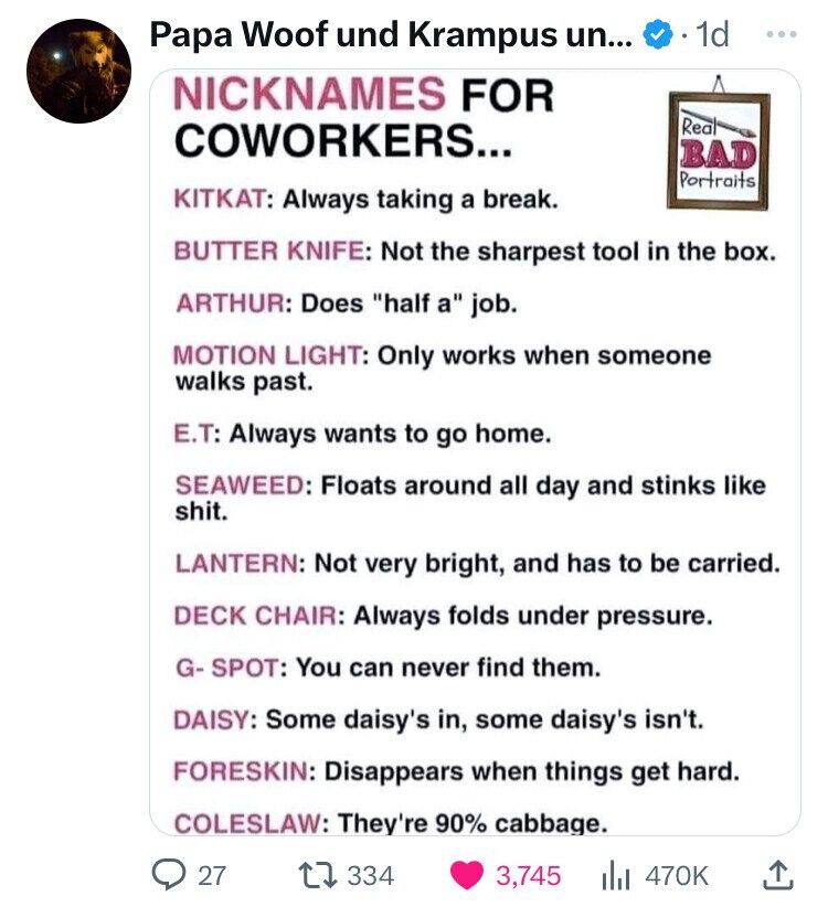 Nicknames for Co-Workers Just call me Daisy. (Better that than Foreskin) Share this: Click to share on X (Opens in new window) X Click to share on Facebook (Opens in new window) Facebook Like Loading... Related Comments are closed.